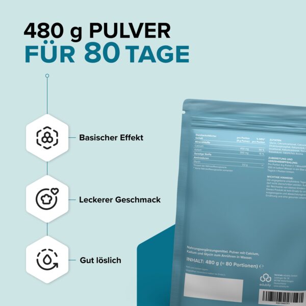 Среднее содержание на порцию (= 6 g порошка): Кальций 450 mg (56 % NRV*), Калий 300 mg (15 % NRV*), Глицин 3,0 g (** NRV отсутствуют). Ингредиенты: глицин, кальцийкарбонат, кальцийцитрат, дикальцийфосфат, калийцитрат, натрийгидрокарбонат, калийкарбонат, разделитель: кремниевая кислота; натуральный аромат. *Процент референтных значений питательных веществ. **Референтных значений нет.
