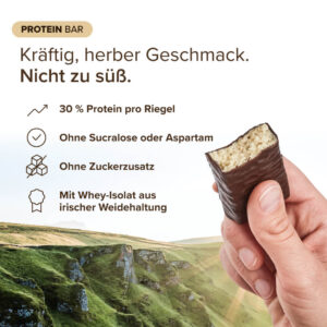 Protein Bar: 30% высококачественного белка из смеси Whey Isolat (ирландское молоко с пастбищного откорма), Whey‑Konzentrat и казеина; функциональные ингредиенты: L‑карнитин, таурин; ванильно‑хрустящая сердцевина в шоколадной глазури; без пальмового масла и без искусственных подсластителей. Collagen Bar: SOLUGEL™ гидролизат коллагена из аргентинского пастбищного содержания с пептидами, поставляющими глицин, пролин и гидроксипролин; богат клетчаткой, с низким содержанием сахара, без искусственных добавок и подсластителей. Chunky Protein Bar: хрустящая оболочка с нежной кремовой и плотной структурой, 30% белка, только 0,5 г сахара на батончик (указано в описании).