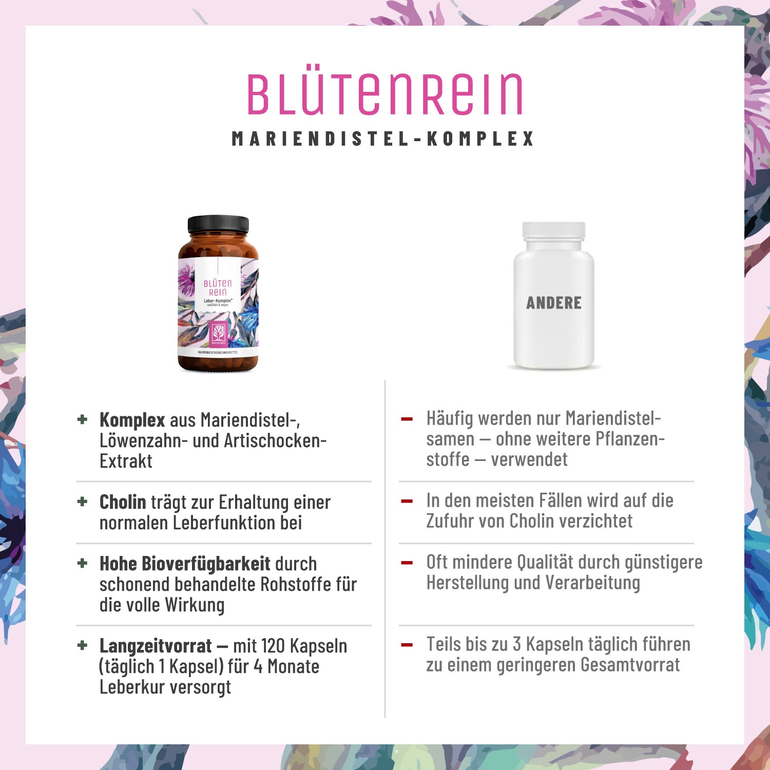 На дневную дозу (1 капсула): экстракт семян расторопши (25:1) 250 mg (из них силимарин 200 mg); экстракт корня одуванчика (10:1) 100 mg; холин 82,5 mg; экстракт листьев артишока (5:1) 50 mg. Дополнительные ингредиенты: холинбитарtrat, оболочка капсулы: гидроксипропилметилцеллюлоза (растительная капсула).