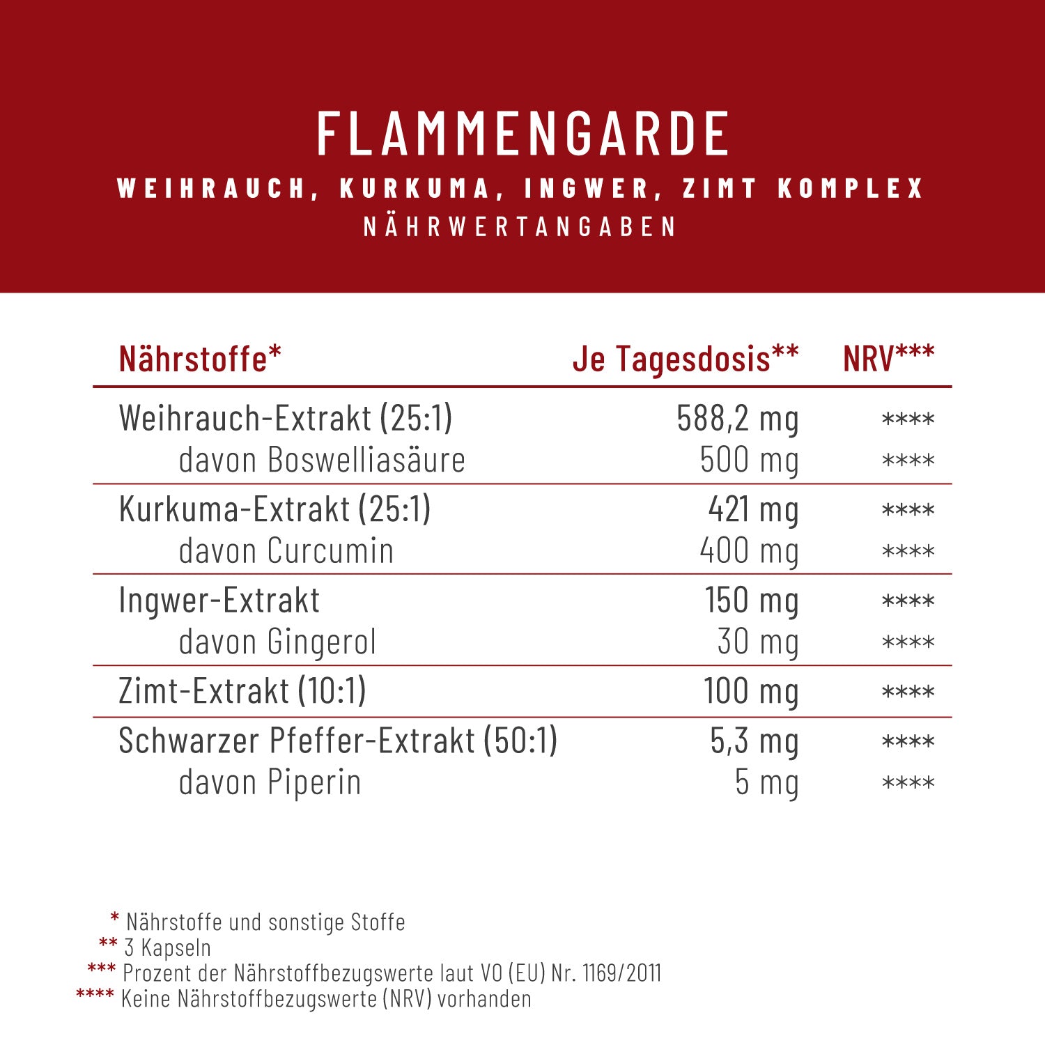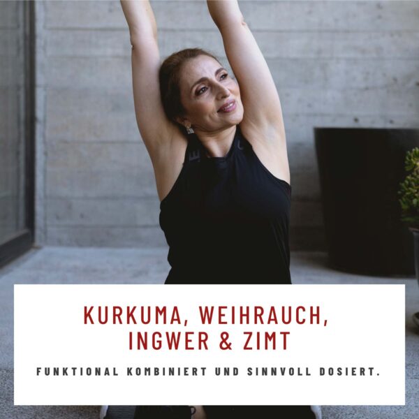 Ингредиенты на суточную дозу (3 капсулы): экстракт ладанника (Weihrauch‑Extrakt) 588,2 мг (в том числе 500 мг босвеллиевой кислоты); экстракт куркумы 421 мг (в том числе 400 мг куркумина); экстракт имбиря 150 мг (в том числе 30 мг гингерола); экстракт корицы 100 мг; экстракт чёрного перца 5,3 мг (в том числе 5 мг пиперина). Покрытие капсулы: гидроксипропилметилцеллюлоза (растительная капсула).
