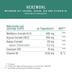 Питательные вещества на суточную дозу (2 капсулы): экстракт боярышника (4:1) 400 мг; экстракт арджуны (10:1) 350 мг; экстракт какао 20 мг (теобромин 4,8 мг); коэнзим Q10 15 мг; витамин B1 0,55 мг (50 % NRV).
