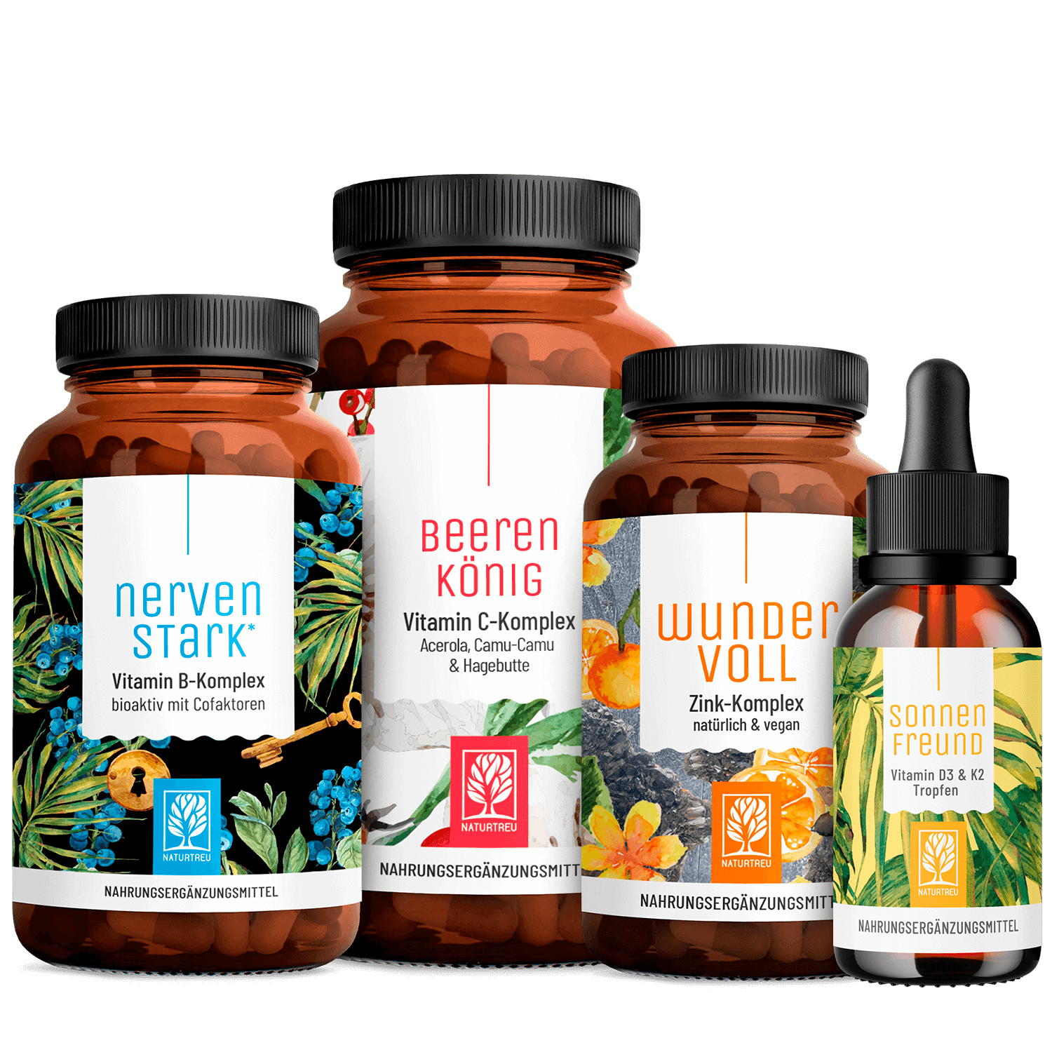 Nervenstark: содержит биоактивные витамины группы B (B1, B2, B3, B5, B6, B7/биотин, B9/фолат, B12) для поддержки нормальной функции нервной системы и психической функции.