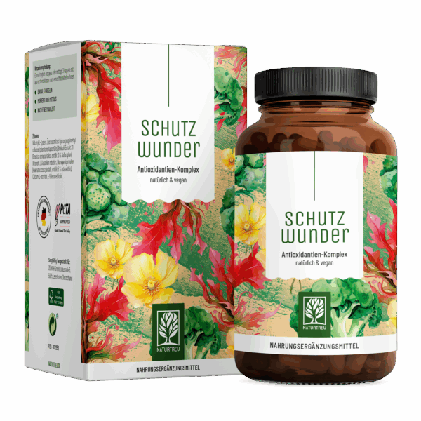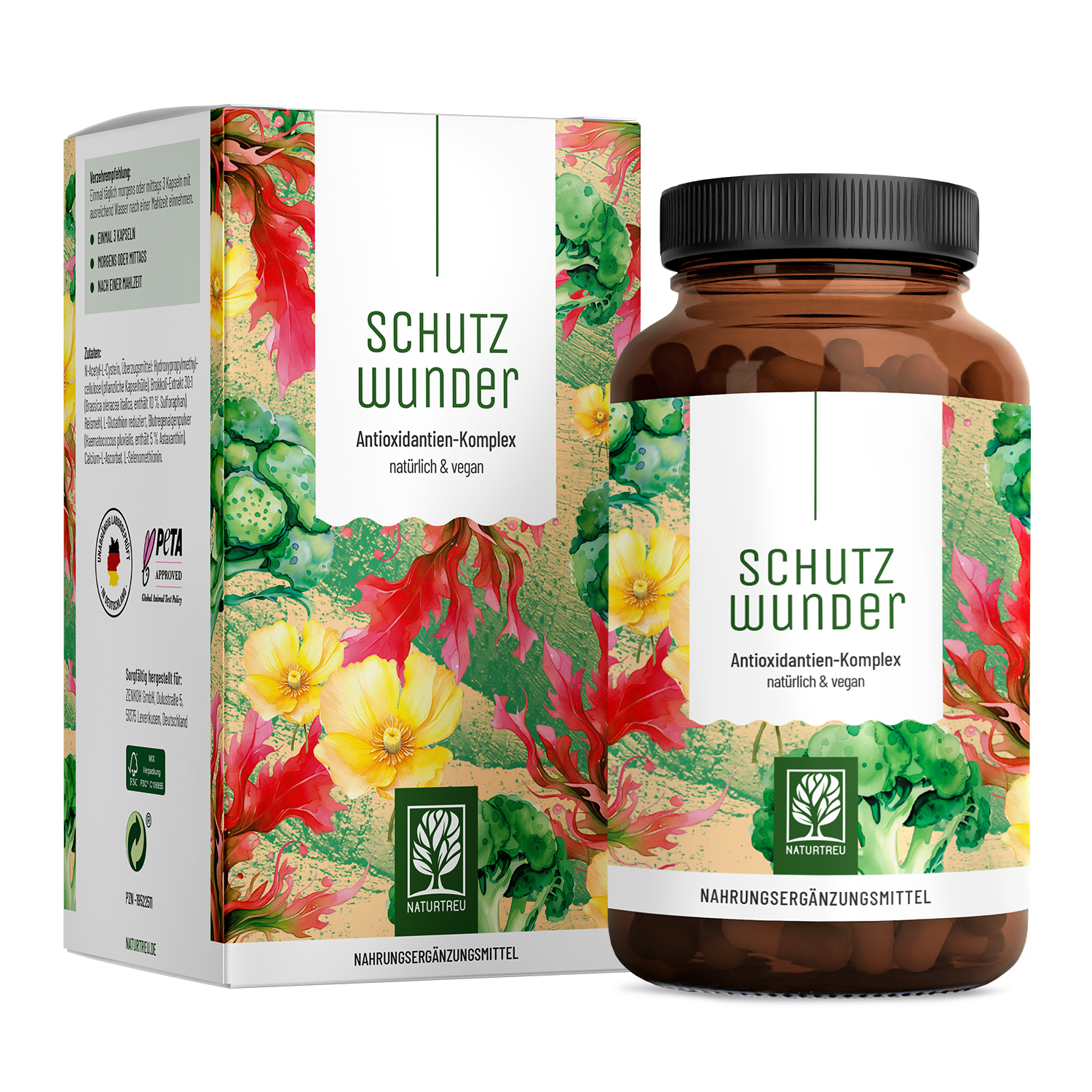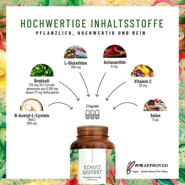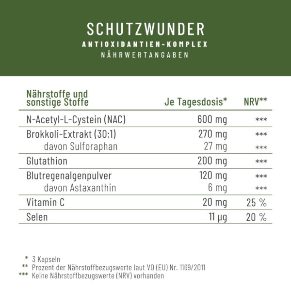 На суточную дозу (3 капсулы): N‑ацетил‑L‑цистеин (NAC) 600 мг; экстракт брокколи (30:1) 270 мг (в т.ч. сульфорафан 27 мг); восстановленный L‑глутатион 200 мг; порошок водорослей Haematococcus pluvialis 120 мг (в т.ч. астаксантин 6 мг); кальций‑L‑аскорбат (витамин C) 20 мг; селен (в форме селенометионина) 11 мкг. Дополнительные компоненты: оболочка из гидроксипропилметилцеллюлозы (растительная капсула), рисовая мука.