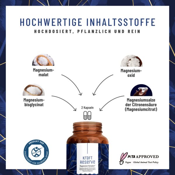 Kraftreserve (180 капсул): магниевые соли лимонной кислоты, оксид магния, магниевый малат, магний‑бисглицинат, рисовая мука, оболочка: гидроксипропилметилцеллюлоза (растительная капсула). Магний (всего) 400 mg на суточную дозу (2 капсулы); ингредиенты на суточную дозу: магниевые соли лимонной кислоты 420 mg, оксид магния 400 mg, магний‑бисглицинат 333 mg, магниевый малат 350 mg.