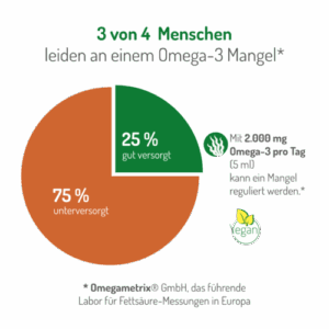 Жидкий веганский препарат омега‑3 для дополнительного обеспечения длинноцепочечными омега‑3‑жирными кислотами (EPA и DHA). Рекомендуемая суточная доза 5 мл (1 чайная ложка) обеспечивает 2 000 мг омега‑3; из них примерно 1 104 мг EPA на суточную дозу, для регулирования уровня омега‑3 в организме.